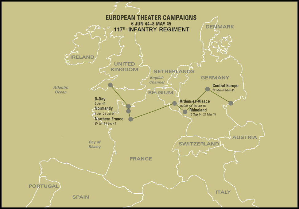The 30th Infantry Division arrived in England, 22 February 1944, and trained until June. It landed at Omaha Beach, Normandy, 15 June 1944, secured the Vire-et-Taute Canal, crossed the Vire River, 7 July 1944.